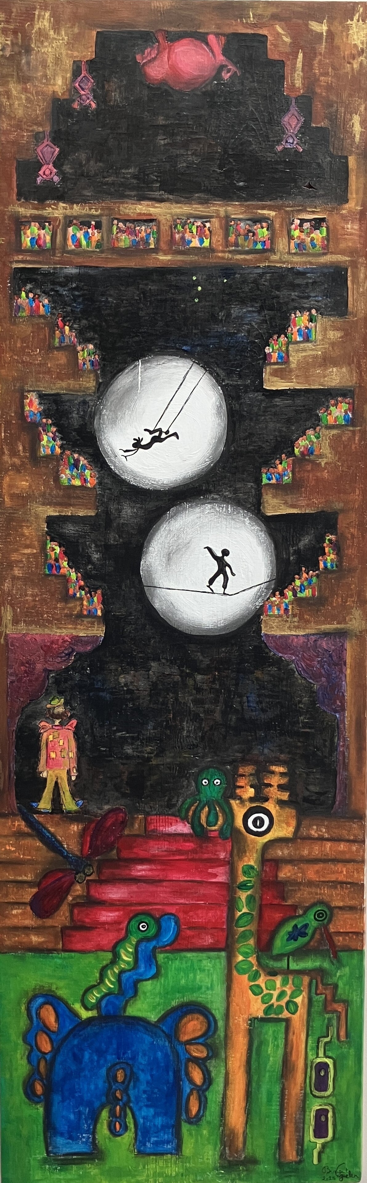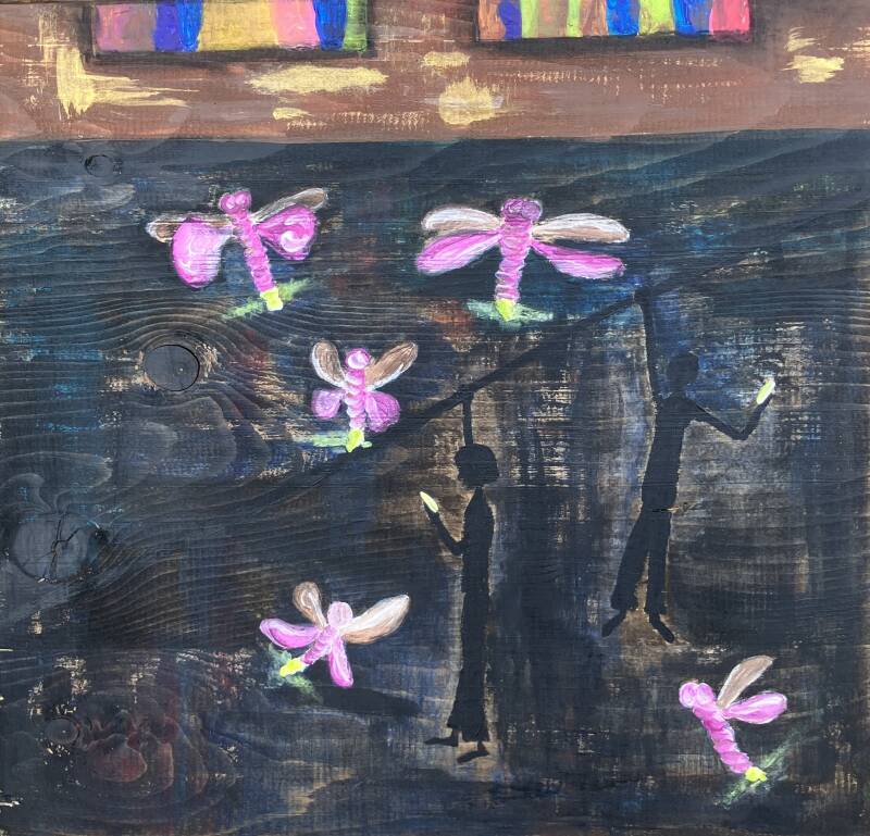 [De glimwormen creatie is een zoom van het werk hiernaast. Zoek de lichtpuntjes in het donker. Het volledige werk bestaat uit vier panelen]