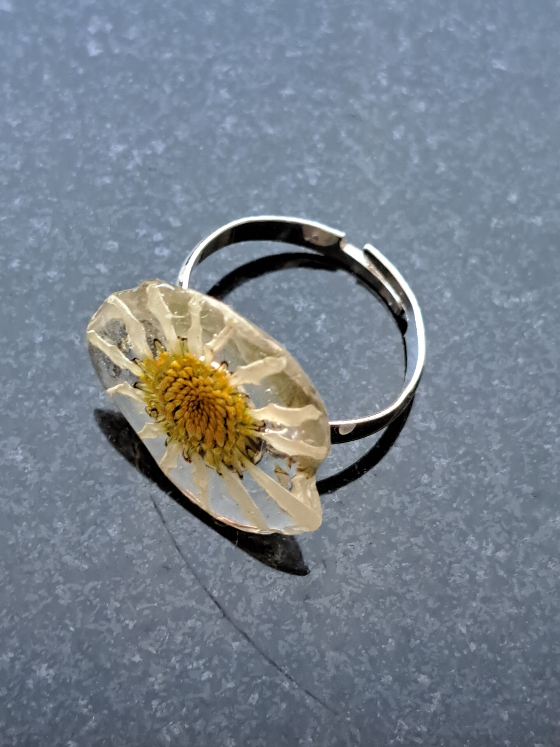 Het begon met de aankoop van een ring op een eco-fairtradebeurs. Het ging verder met het idee “dit moet ik toch zelf kunnen”, het vinden van een dode vlinder in de berm, het wachten tot er een plekje vrijkwam in een workshop, het verwerken van een stukje vlindervleugel in een ring, de aankoop van 25 g epoxyhars en thuis verder experimenteren. Tot het geïnspireerd raken door een zee-egel skeletje op het strand, een klavertje of een madeliefje in de berm.